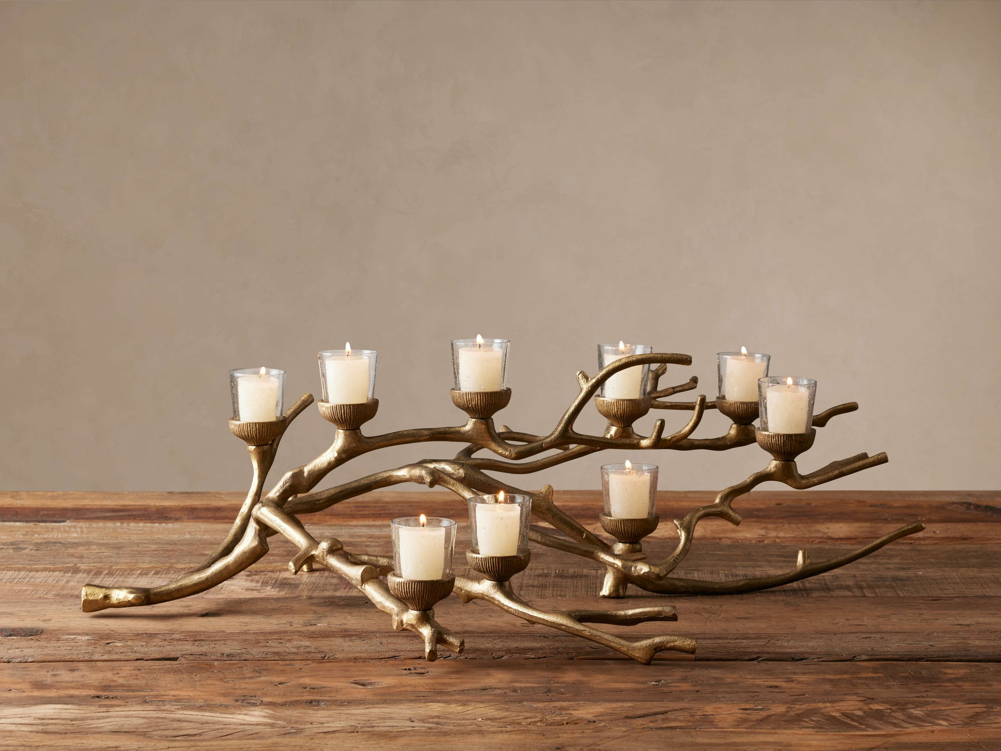 - The nature-inspired shape of our Branch Candleholder is cast from aluminum in an antiqued silver complemented by silver glass votive cups.