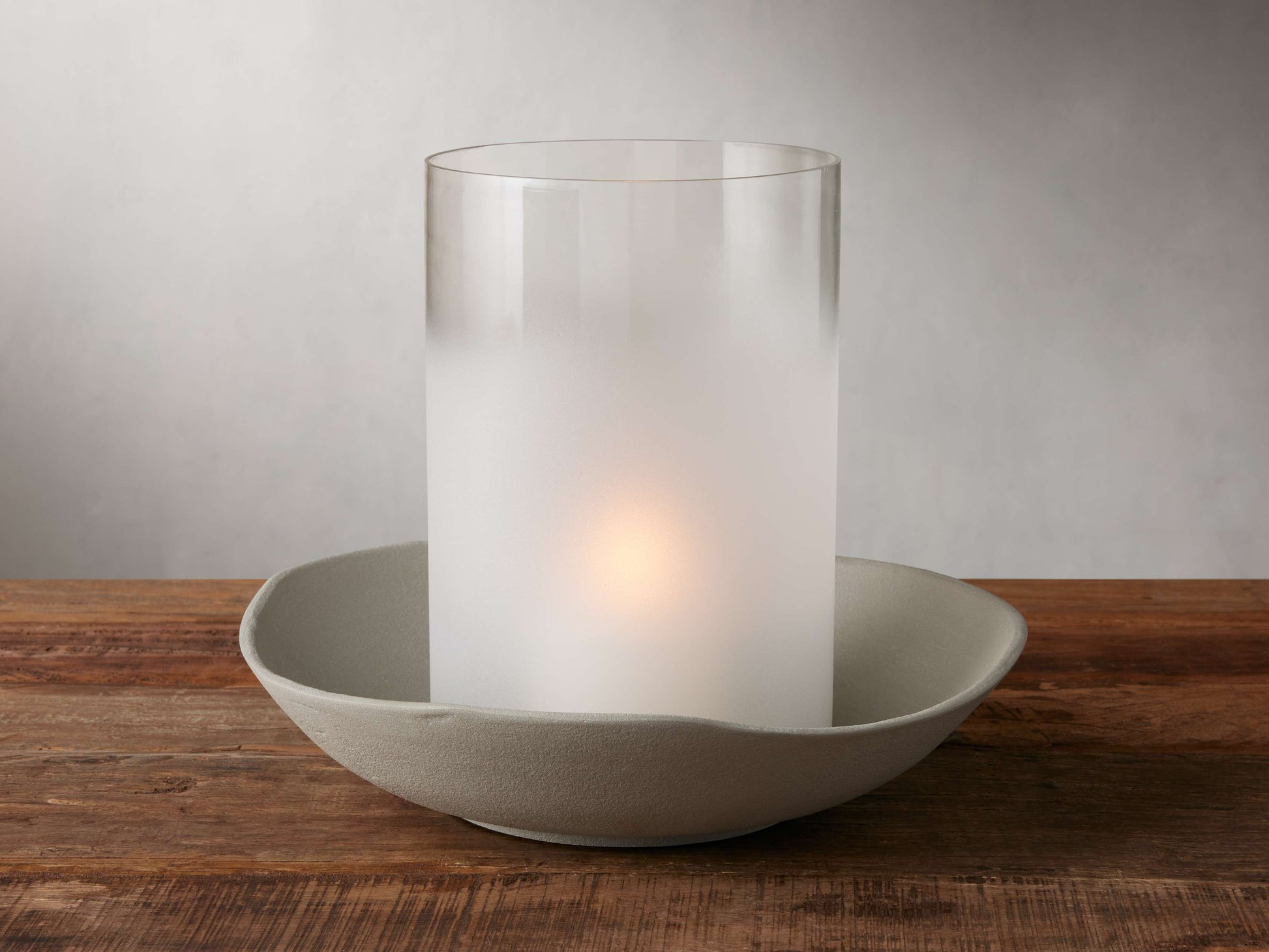 - Whether you’re gathering indoors or out, our Delos Wave Hurricane adds charming illumination to any space. Made from cast aluminum with a frosted-glass cloche, Delos can be used with a live-flame candle for an elevated, organic glow.