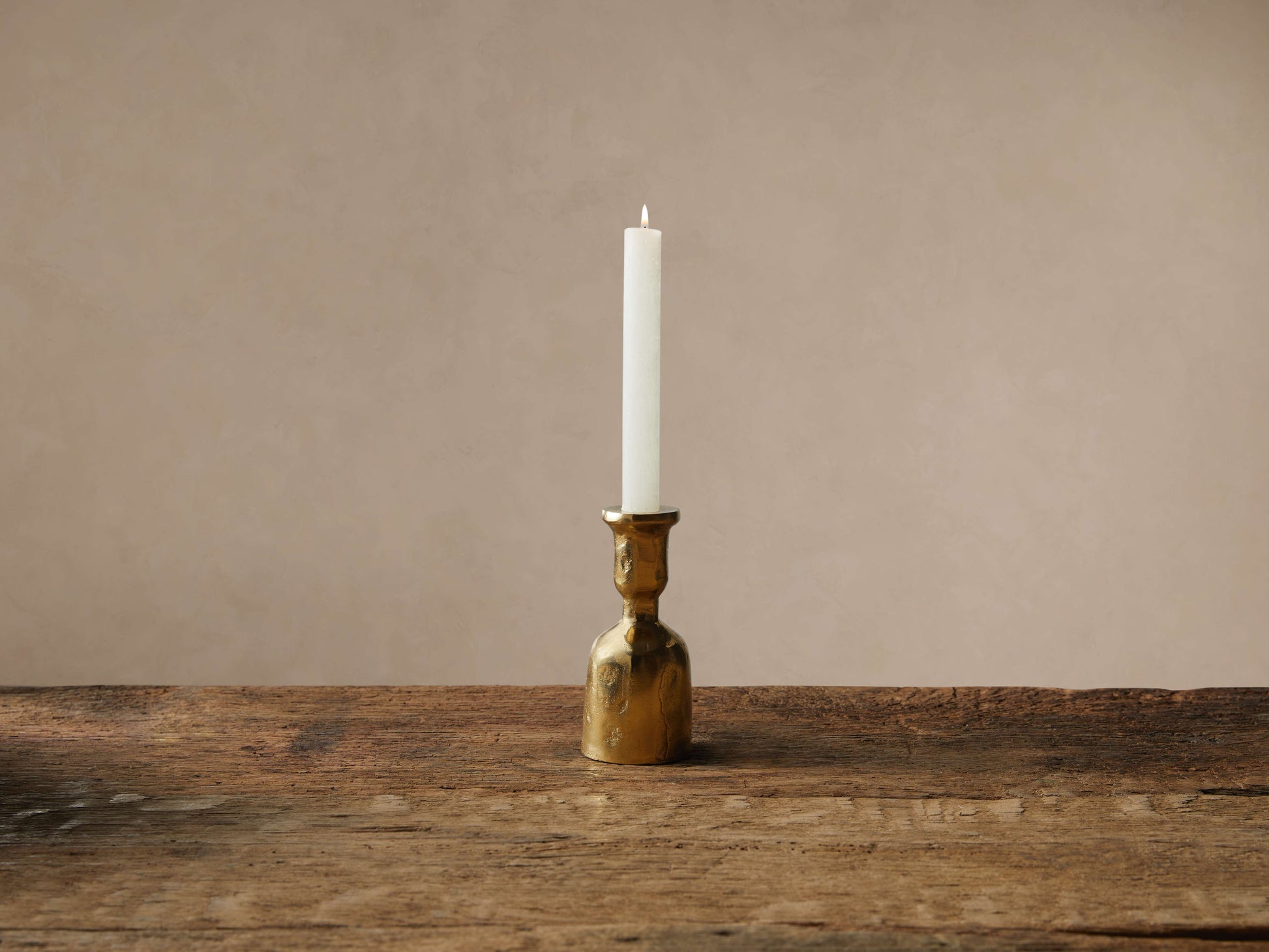 - Add antique-inspired warmth to your mantle, console, or table décor. Our Thira Taper Holder is hand-cast from solid brass, giving it a heavy weight and beautifully textured look.